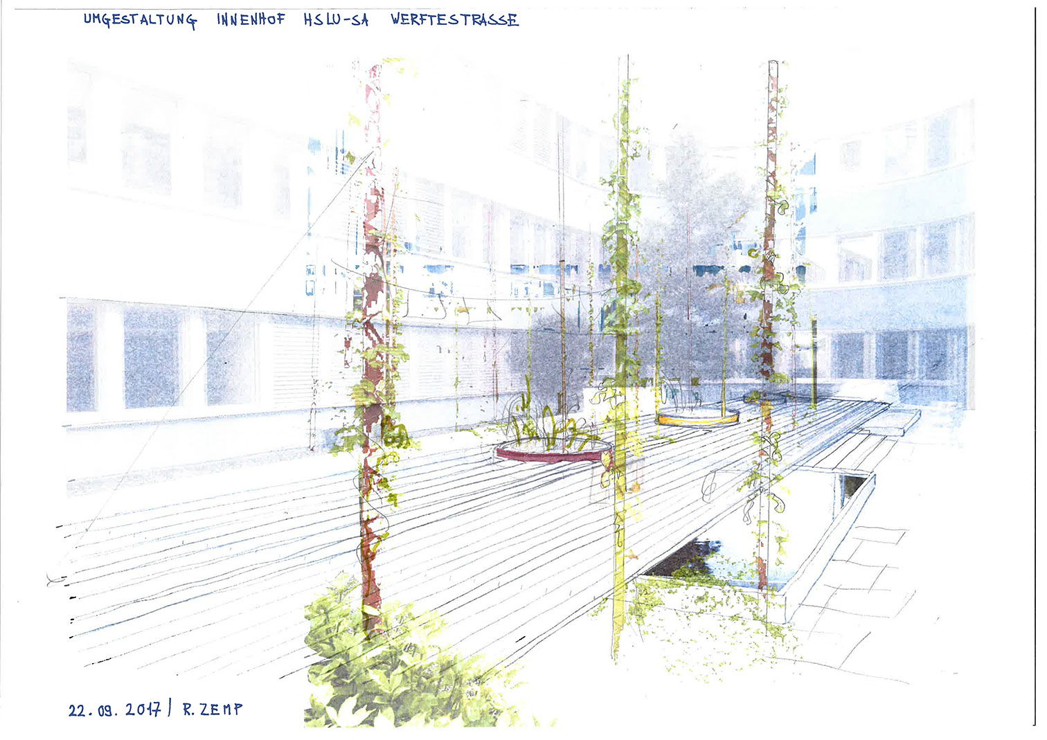Auf Initiative der Studierenden wurde der bestehende Innenhof der Hochschule Luzern – Soziale Arbeit mit kleinsten Eingriffen umgestaltet. Die bestehende streng geometrische Gestaltung wird durch ein längs gerichtetes Holzdeck überlagert, Rankpfähle mit Hopfen zonieren den Raum und schaffen zusammen mit den neu bemalten Pflanztrögen eine anregende Atmosphäre. Planung und Ausführung gingen Hand in Hand und fanden vor Ort in Zusammenarbeit mit Studierenden und dem Hausdienst statt.