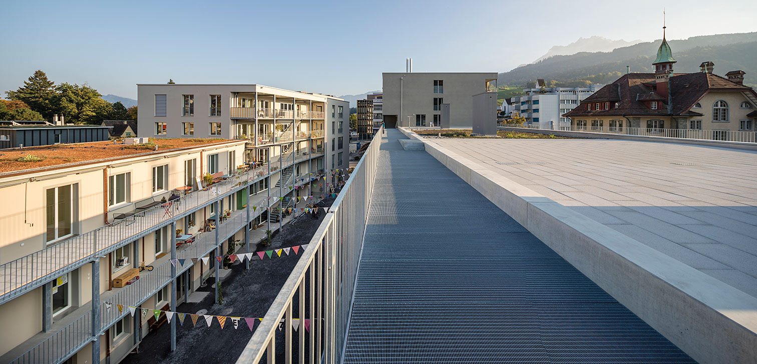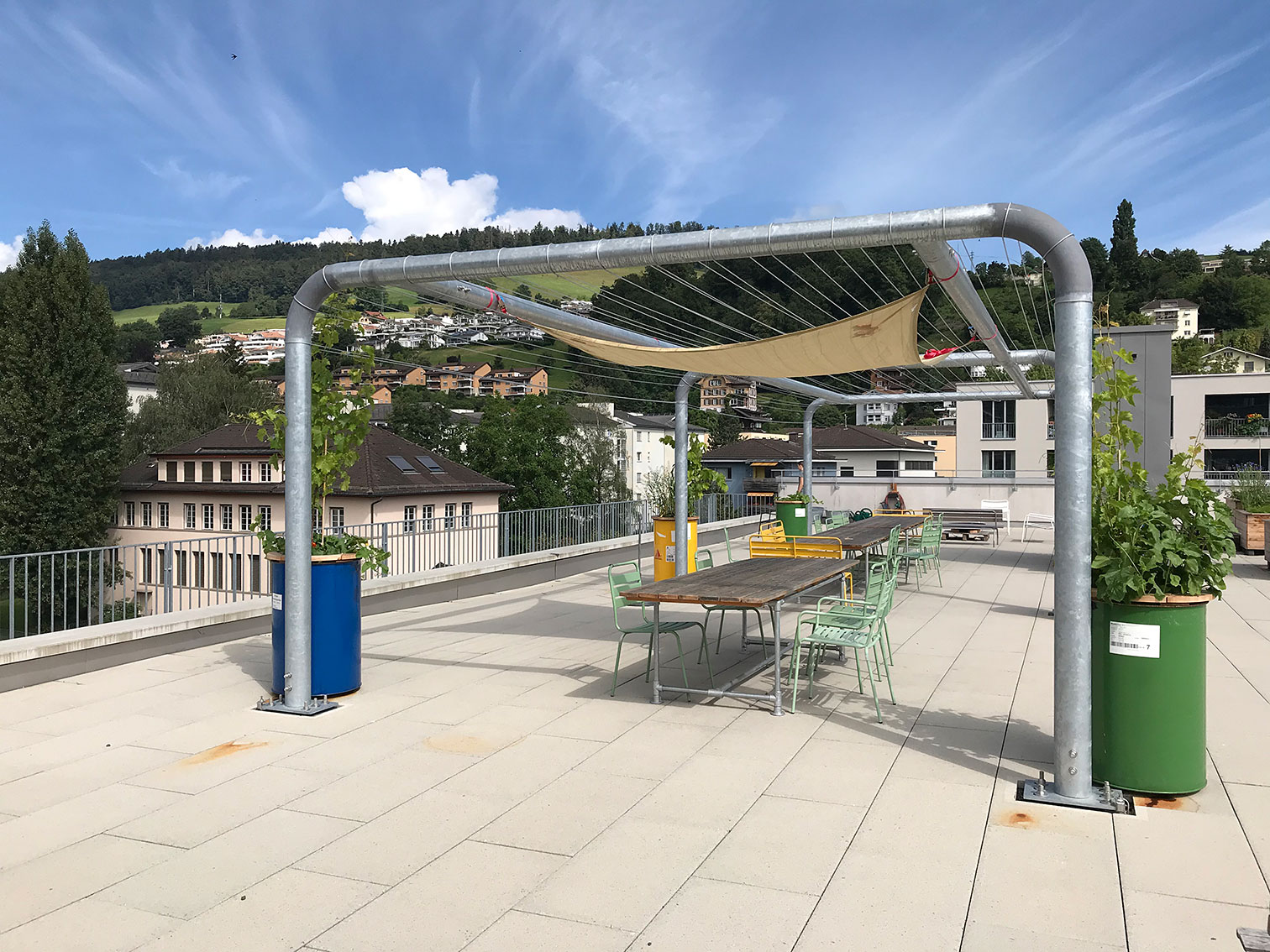 Auf dem Areal der ehemaligen Krienser Teigwarenfabrik Wenger erstellte die Genossenschaft Wohnwerk Luzern eine Überbauung mit Wohnungen, Ateliers und Gewerberäume für Menschen verschiedener Altersklassen und Gewerbetreibenden. Zusammen mit der Bewohnerschaft wurde die Neugestaltung der gemeinsamen Dachterrasse in Angriff genommen. An mehreren Ideenwerkstätten wurden Ideen, Bedürfnisse und Stimmungen reflektiert und mögliche Szenen auf der Dachterrasse grafisch, narrativ und szenisch dargestellt. Vieles davon wurde schliesslich vor Ort mit der Bewohnerschaft umgesetzt und weiterentwickelt. Die grosse Pergola machte dabei den Anfang: Als vielfältig bespielbares Gerüst spendet sie Schatten und ist empfänglich für weitere Interventionen. Die Konstruktion aus Rundstahl mit den dazwischen gespannten «Spaghettiseilen» spielt auf die ehemals vor Ort produzierte Pasta an.